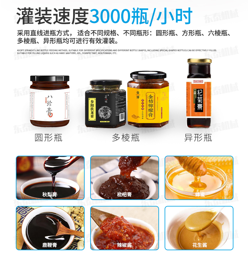 枇杷膏灌裝機生產線適用于各種1、各種膏滋如:秋梨膏、枇杷膏、鹿鞭膏、蜂蜜等的灌裝。2、調味醬如:香菇醬、辣椒醬、豆瓣醬、花生醬、芝麻醬、牛油火鍋底料、紅油火鍋底料。3、采用多規格的灌裝轉閥、灌裝頭,可適應不同客戶物料的灌裝需求。
