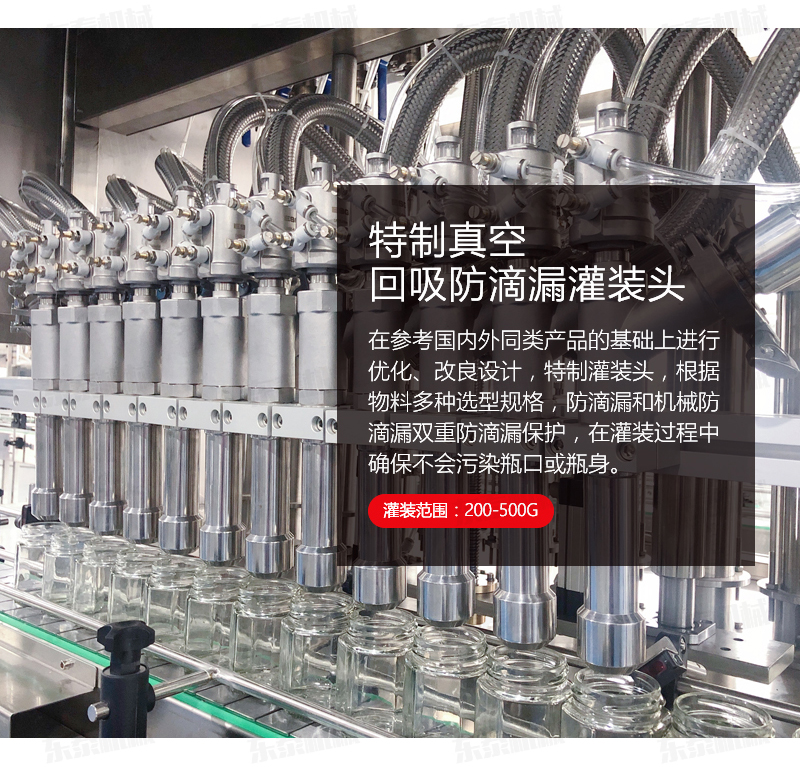 3、灌裝機采用橫推料的方式,大大縮短了下料斗到灌裝頭的距離,提高了灌裝速度,更重要的是解決了含油量大的物料在灌裝過程中出現的有些瓶油多,有些瓶醬多的灌裝難題,大大提高了灌裝精度。