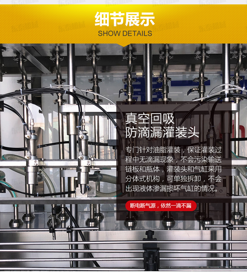 2、設(shè)計及真空回吸系統(tǒng)保證灌裝過程中無滴漏現(xiàn)象,不會污染輸送鏈板和瓶體。灌裝頭和氣缸采用分體式機(jī)構(gòu),可單獨(dú)拆卸,不會出現(xiàn)液體滲漏損壞氣缸的情況。亞德客氣缸經(jīng)久耐用,其他密封等配件使用標(biāo)準(zhǔn)件,更換維護(hù)簡單方便。