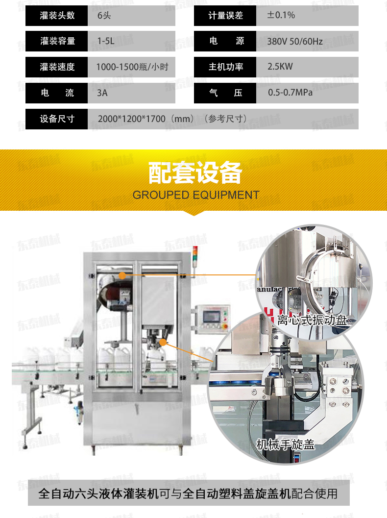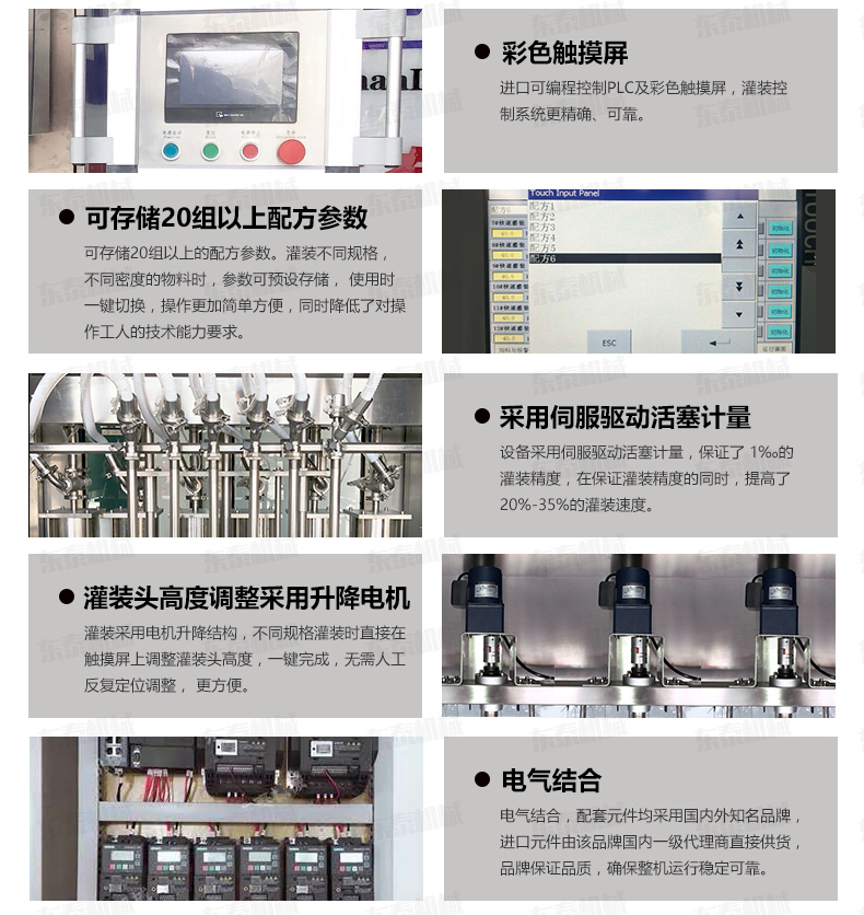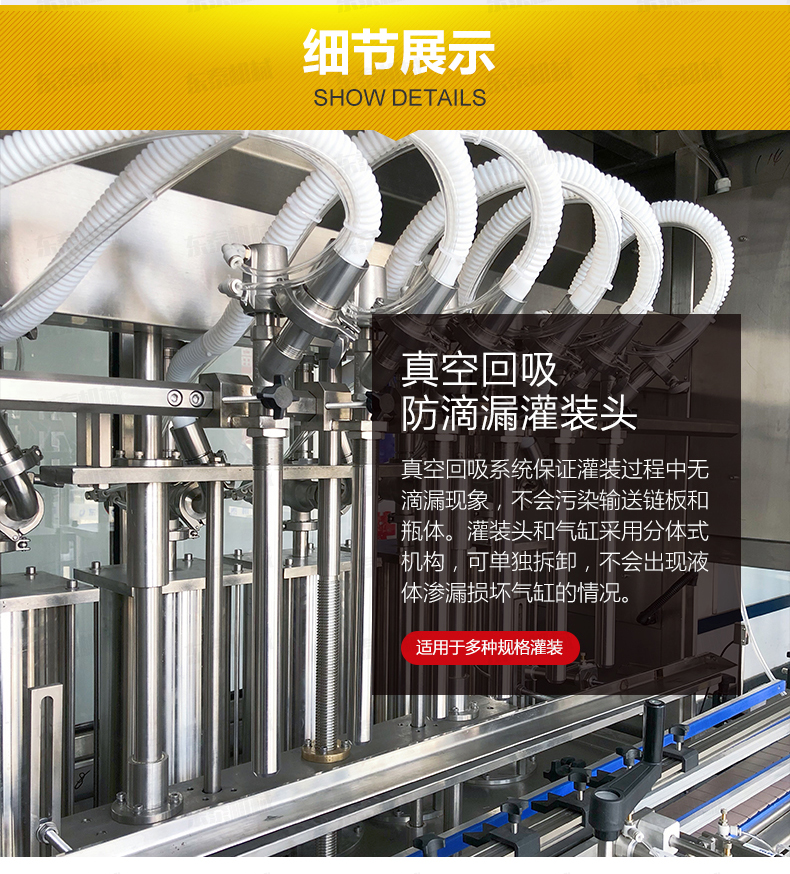 5、具有無瓶不灌裝、自動進瓶出瓶、自動定位灌裝、自動控制液位等功能,自動化程度高;灌裝嘴設計科學合理,配防滴漏裝置,灌裝不滴漏,擁有物料瓶及設備的干凈衛生。
