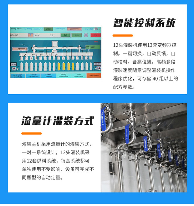 1.智能控制系統(tǒng),12頭灌裝機(jī)使用13套變頻器控制。一鍵切換,自動反饋,自動校對。